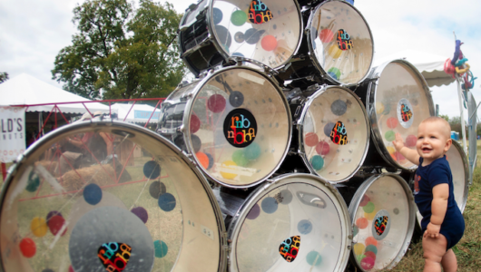 A whole slew of drums, donated to Roots N Blues by Nate White and Palen Music Center, inspired this creation. We had big ideas of actually setting up the drums for the public to play on but decided the noise would be too much. Lisa designed an easy pyramid sculpture instead.